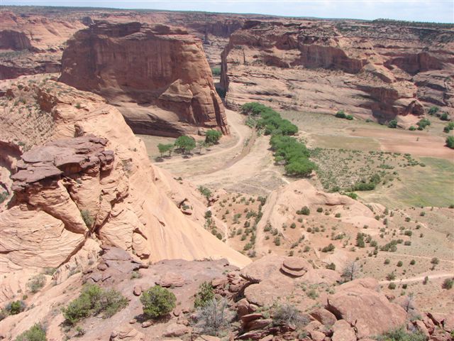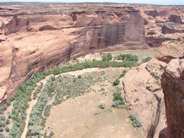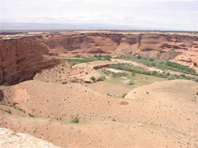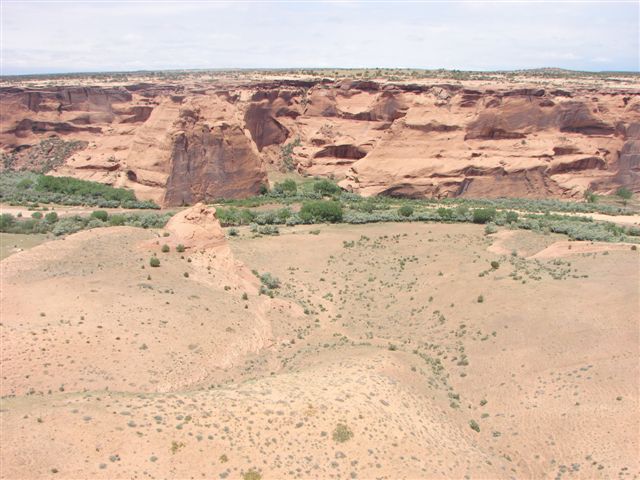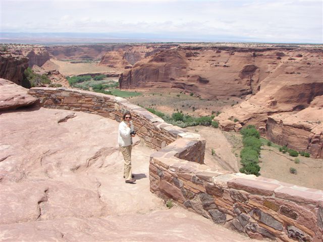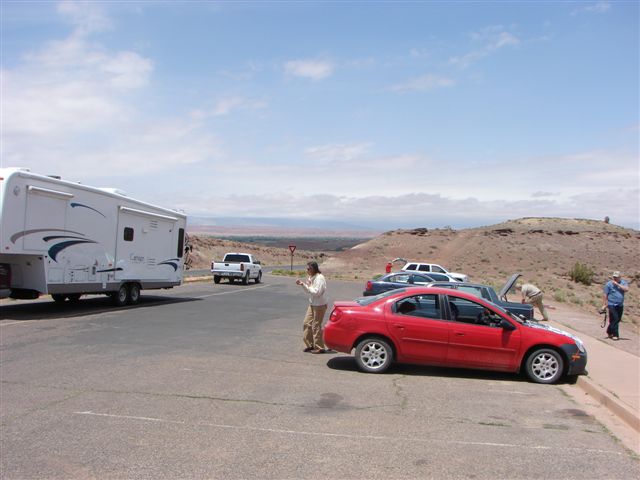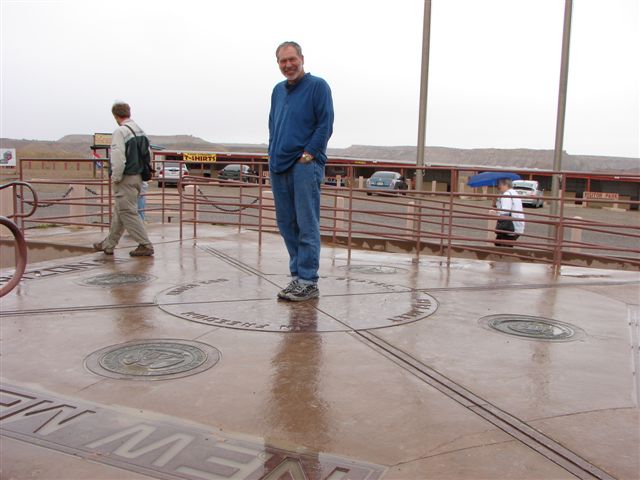 We left Holbrook looking to an 80 degree sunny day and arrived at Mesa Verde to snow in the air and 40 degrees. On the way back from the hot tub tonight we looked up to the mesa and it was white on top because the trees were covered in wet snow. We stopped at Canyon de Chelly (de shay) on the way up here. The roads were wide and the parking lots had spaces for RVs so we spent an hour or so making about a half a dozen stops on the south rim. It was sunny but windy and a bit cool. Another beautiful place. We would like to have gone into the floor of the canyon with a Navajo guide, maybe next time. We stopped at the Four Corners monument and circled the marker. Ah, Crawford traveling, 4 states in under 30 seconds while pulling an RV. We are at the Mesa Verde RV resort.