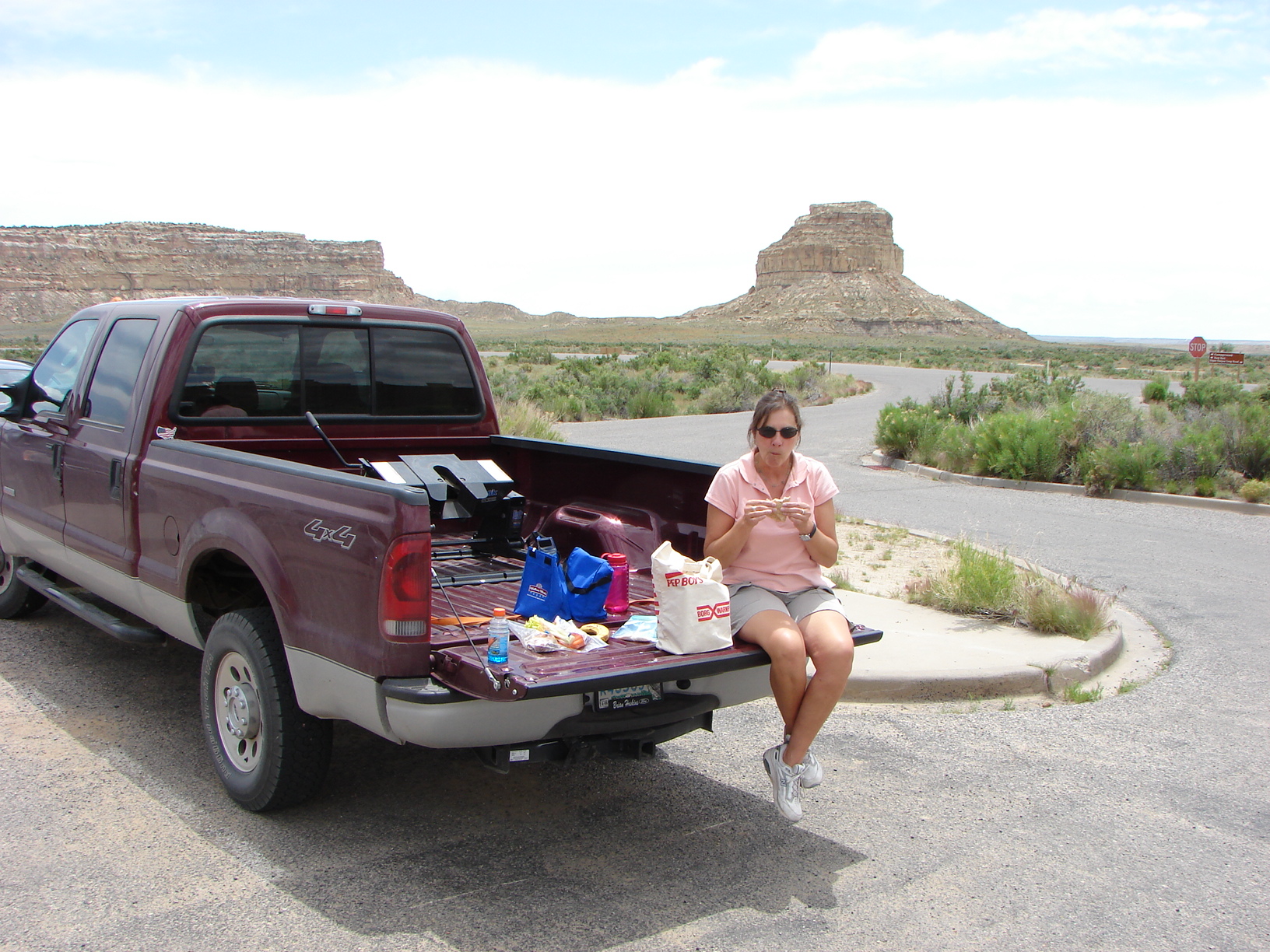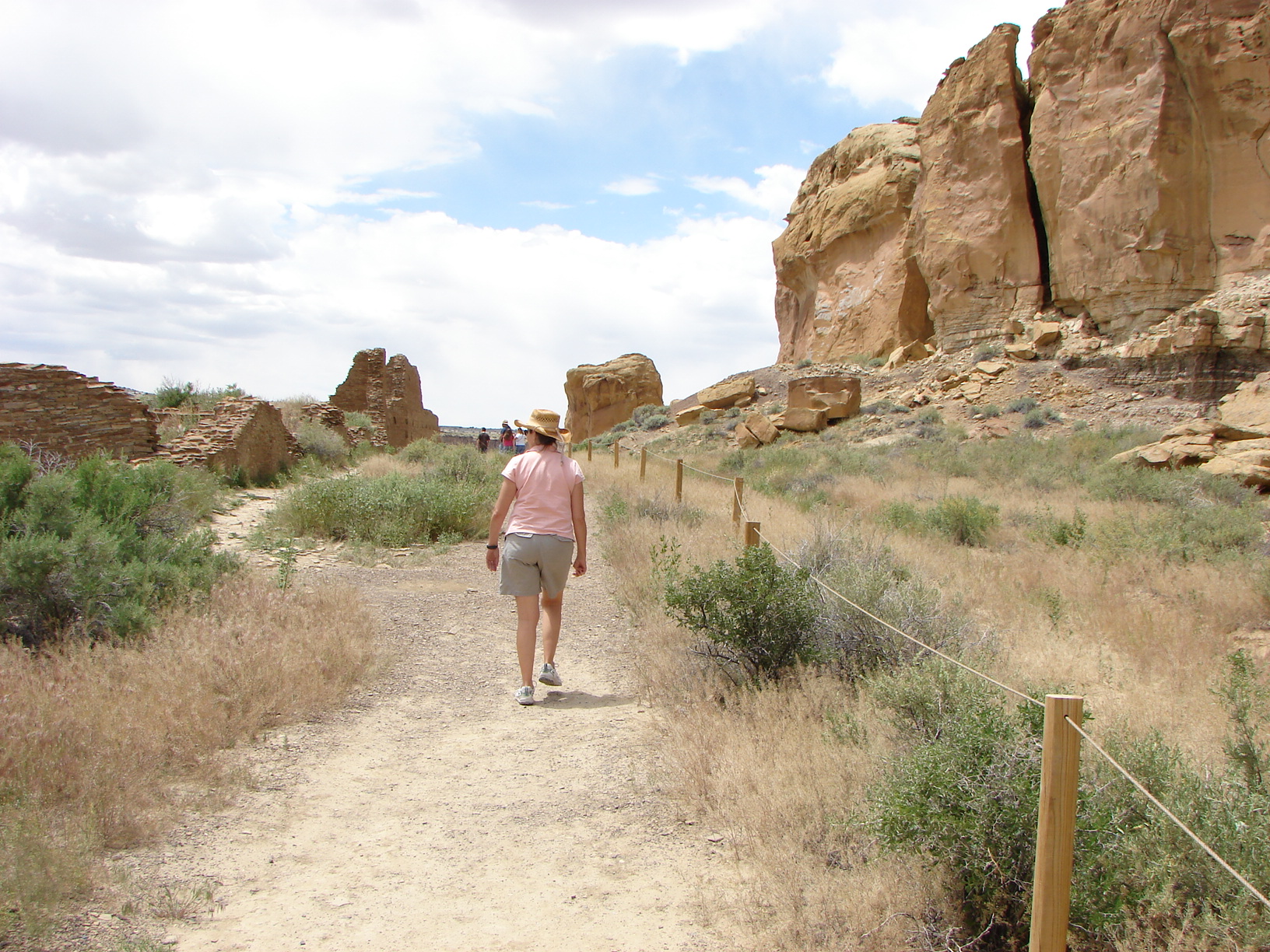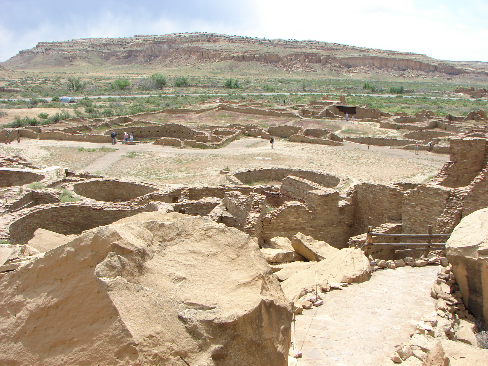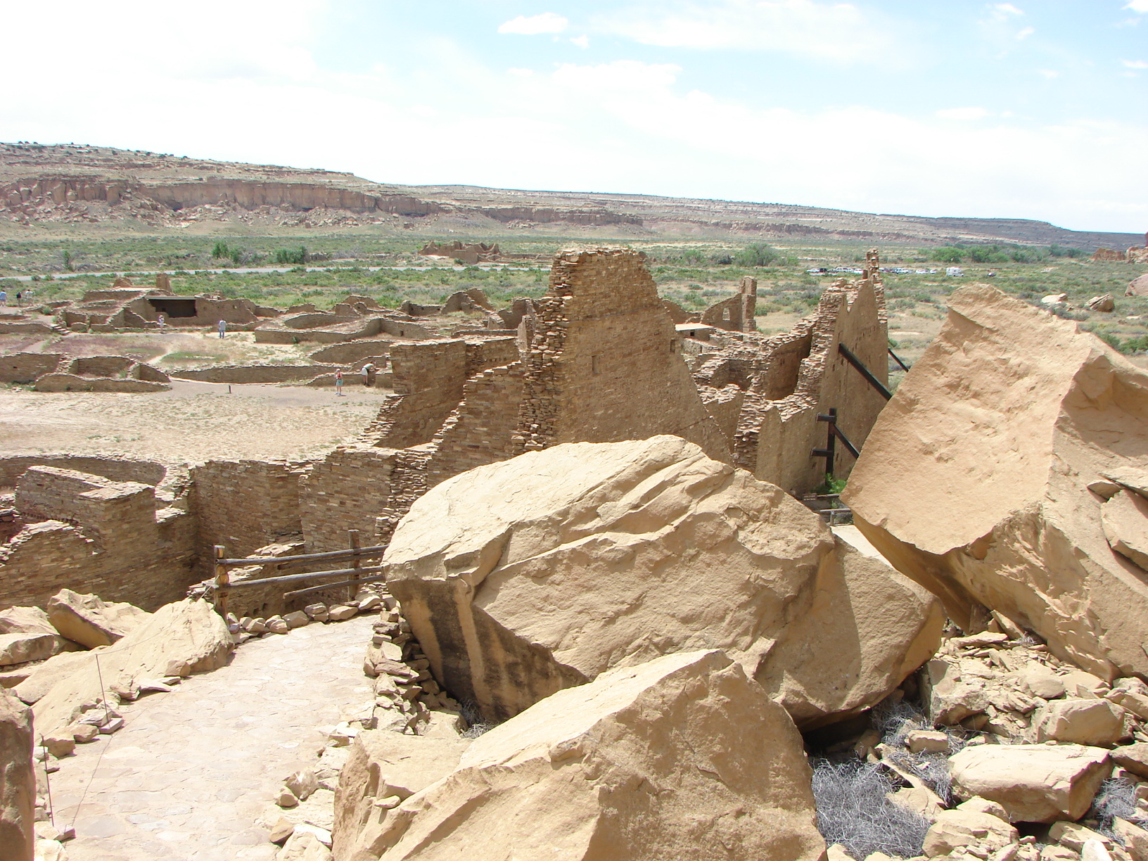 Yesterday we camped at the Desert Rose in Bloomfield, NM. We went into Farmington where they were having their annual Riverfest. It was a large park on the Animas river and we got plenty of hiking. The food and entertainment were great as well. Today we went to Chaco Canyon. It was a very interesting day. They don't get many visitors because it is out of the way and the last 16 miles is a very bumpy dirt road. If you're there when it rains, they won't let you out because the road crosses the stream bed and there are no bridges. We had to drive around a snake on the road on the way in.
