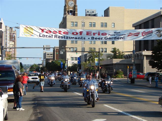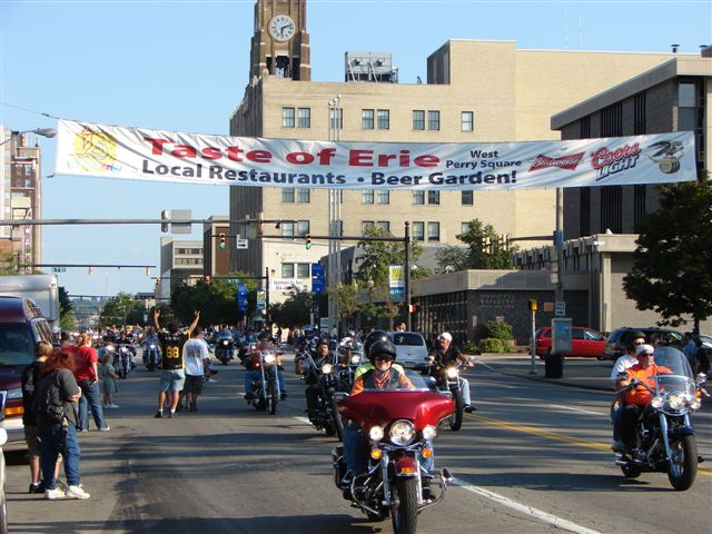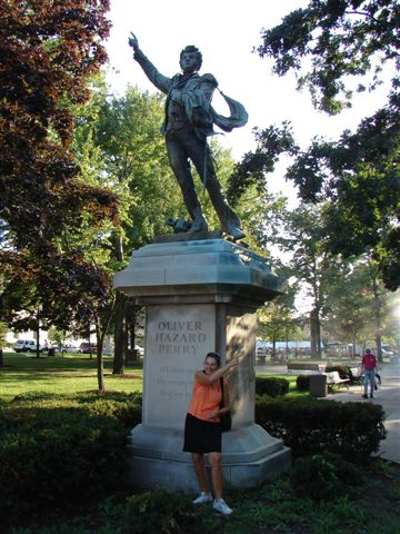 Erie is having a three day event on the bayshore aimed at the motorcycle crowd.  It started with a ride, led by Peter Fonda, from the casino to Liberty Park.  We went downtown early for a chance to walk around.  We met the Selaney's (former neighbors) at Perry Square and caught up on old times.  The ride passed Perry Square for over 10 minutes.  2,000 riders donated $5 apiece for cancer research for the ride.  We visited the Perry statue on the east end of the park whose job, Alesa says, is to direct traffic around Perry Square.  We ended the night with a Blue Moon cone at the Whippy Dip.