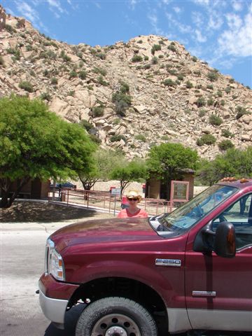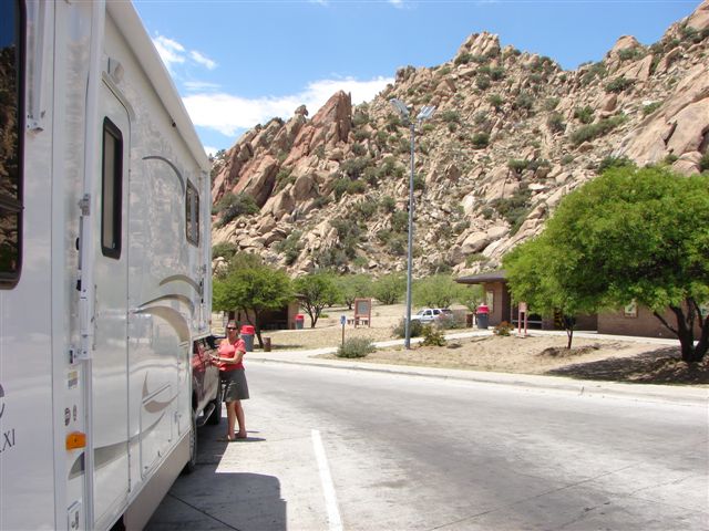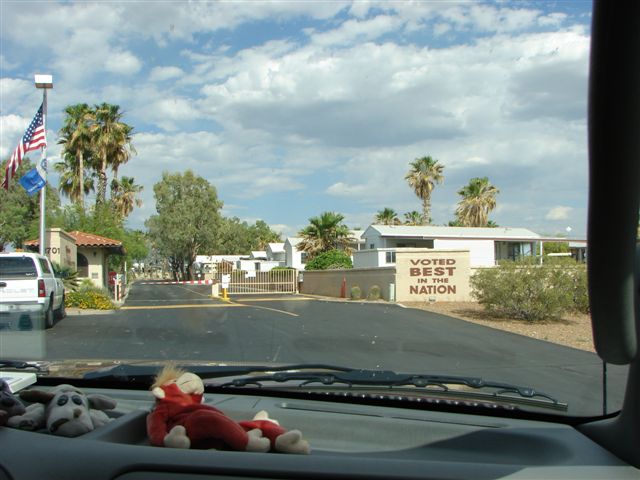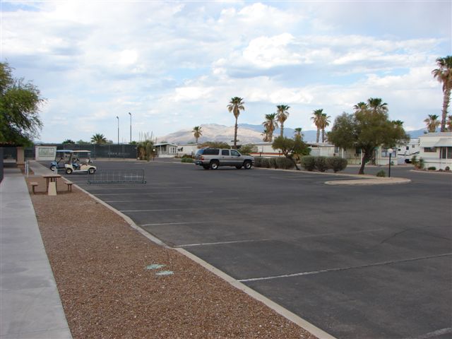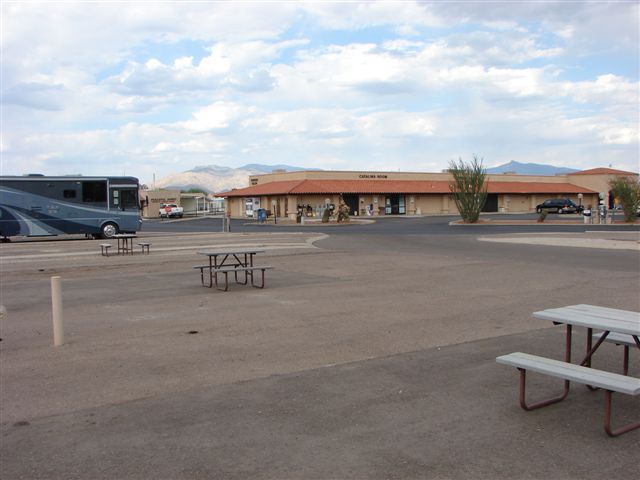 We left Deming this morning and followed I-10 to the west.  We crossed the continental divide and then entered Arizona.  We gained another hour because, although we are still in the Mountain time zone, Arizona does not observe daylight savings time so they didn't 'spring forward' with the rest of us.  It was a short travel day as we went just over 200 miles.  We settled into the Voyager RV resort at about 1 in the afternoon.  It is a fantastic place and has homes, modular homes, permanent trailers and RV's.  It has 6 pool tables in a billiard room, Bocce courts, a par 3 golf course, miniature golf course, putting green, horseshoe pits, 4 pickleball courts (like tennis with paddles and a wiffle ball), 3 swimmimg pools, 2 hot tubs, 2 saunas, exercise rooms, shuffleboard courts, softball fields, 5 tennis courts, ping-pong tables, 2 volleyball courts and a ballroom.  Many classes with the equipment to support them, lapidary and stone polishing, woodworking, ceramics, sewing and jewelry making.  After visiting town and coming back to eat at the restaurant here we spent much of the evening in the pool.  Alesa is looking forward to the aquatics classes.  It was about 100 degrees but, believe it or not, without the humidity, it is not bad if you don't overdo the sun and get plenty to drink.