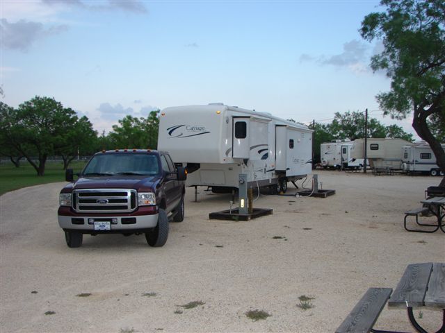 We left Denton this morning and travelled through Abilene and arrived at the KOA in San Angelo at 3:30. The weather was good but we had a stong headwind all the way. We are again dealing with Tornado and Thunderstorm warnings but it is all north and west of us. We had a formation of about 12 h